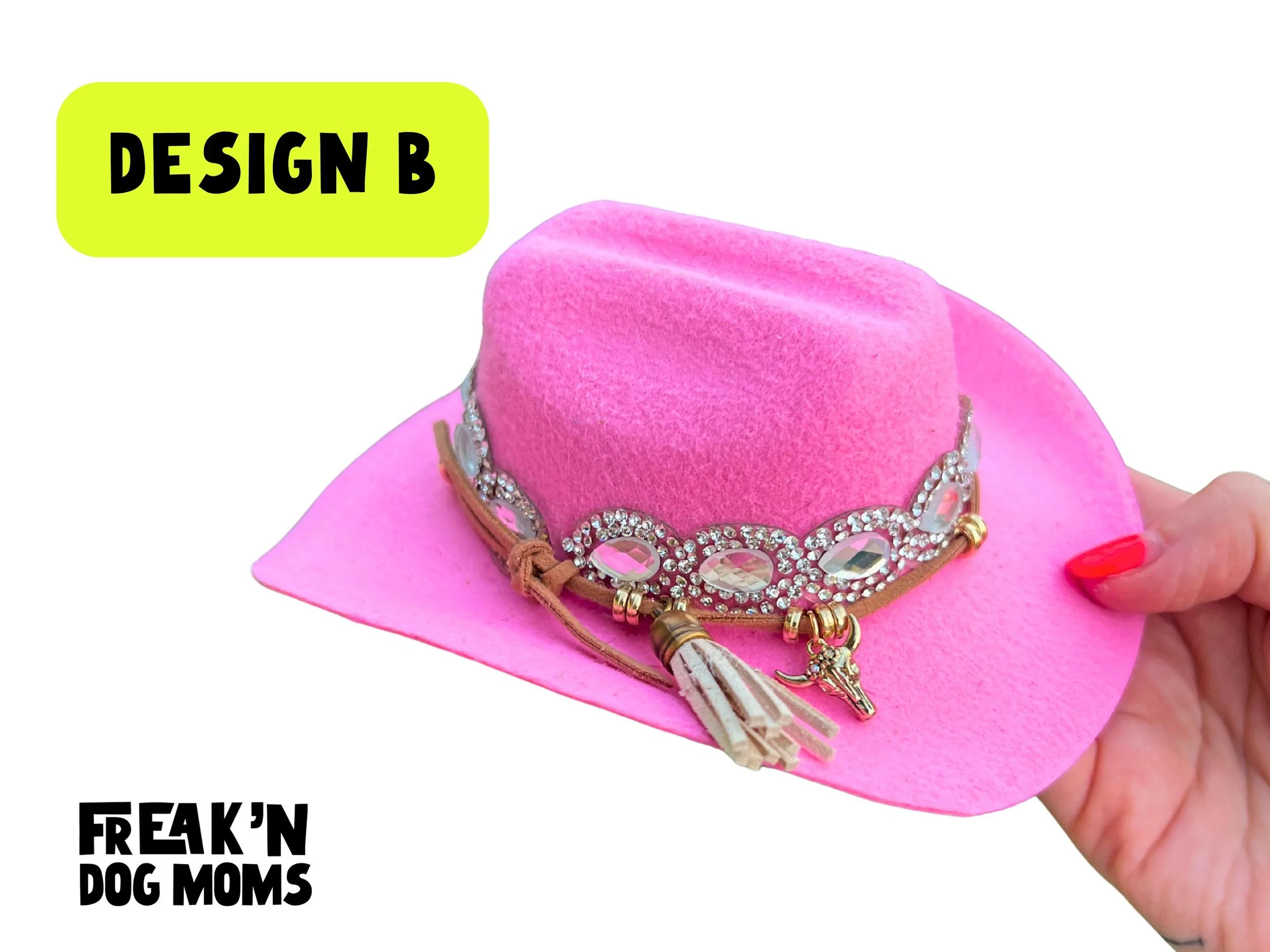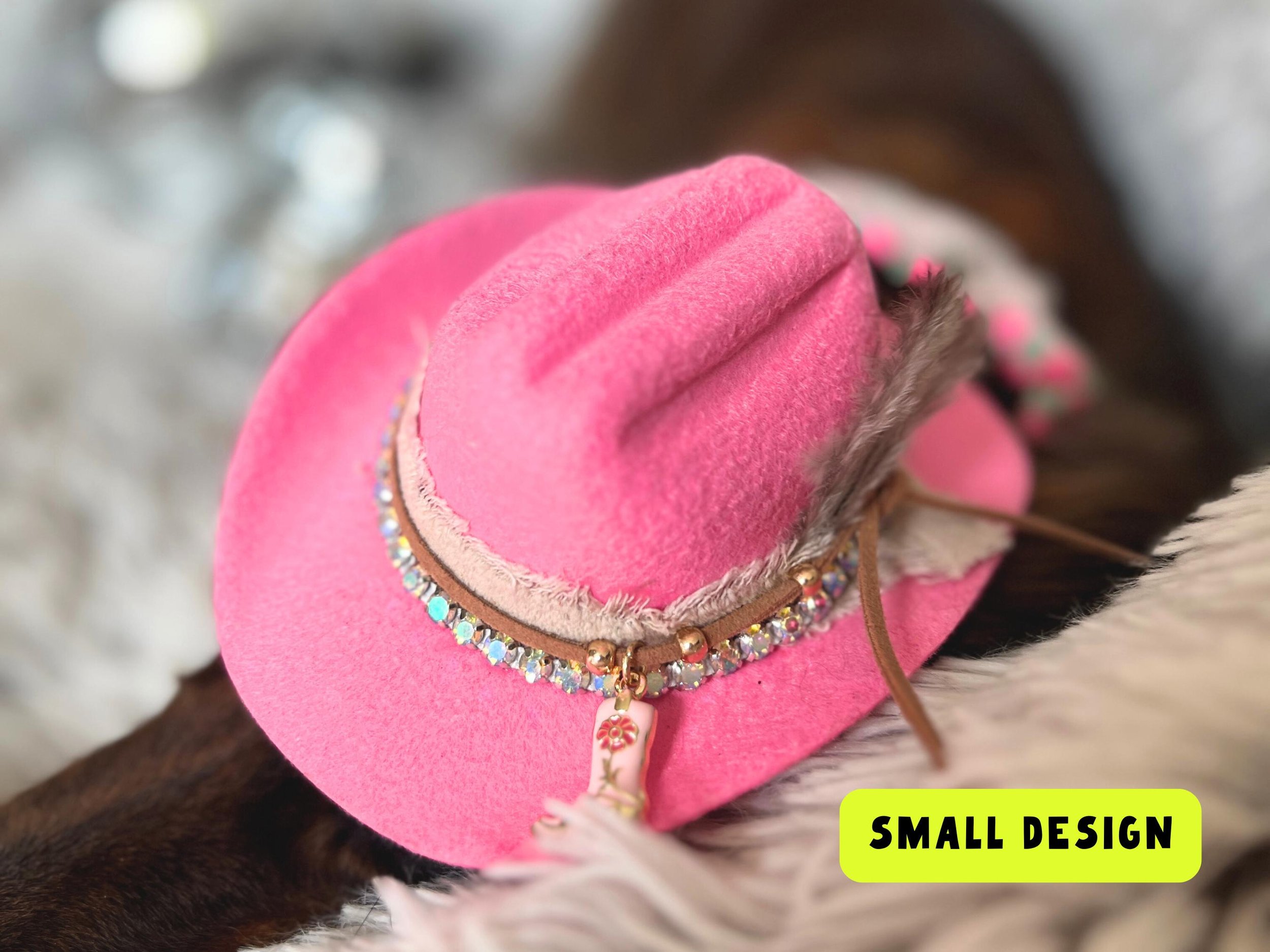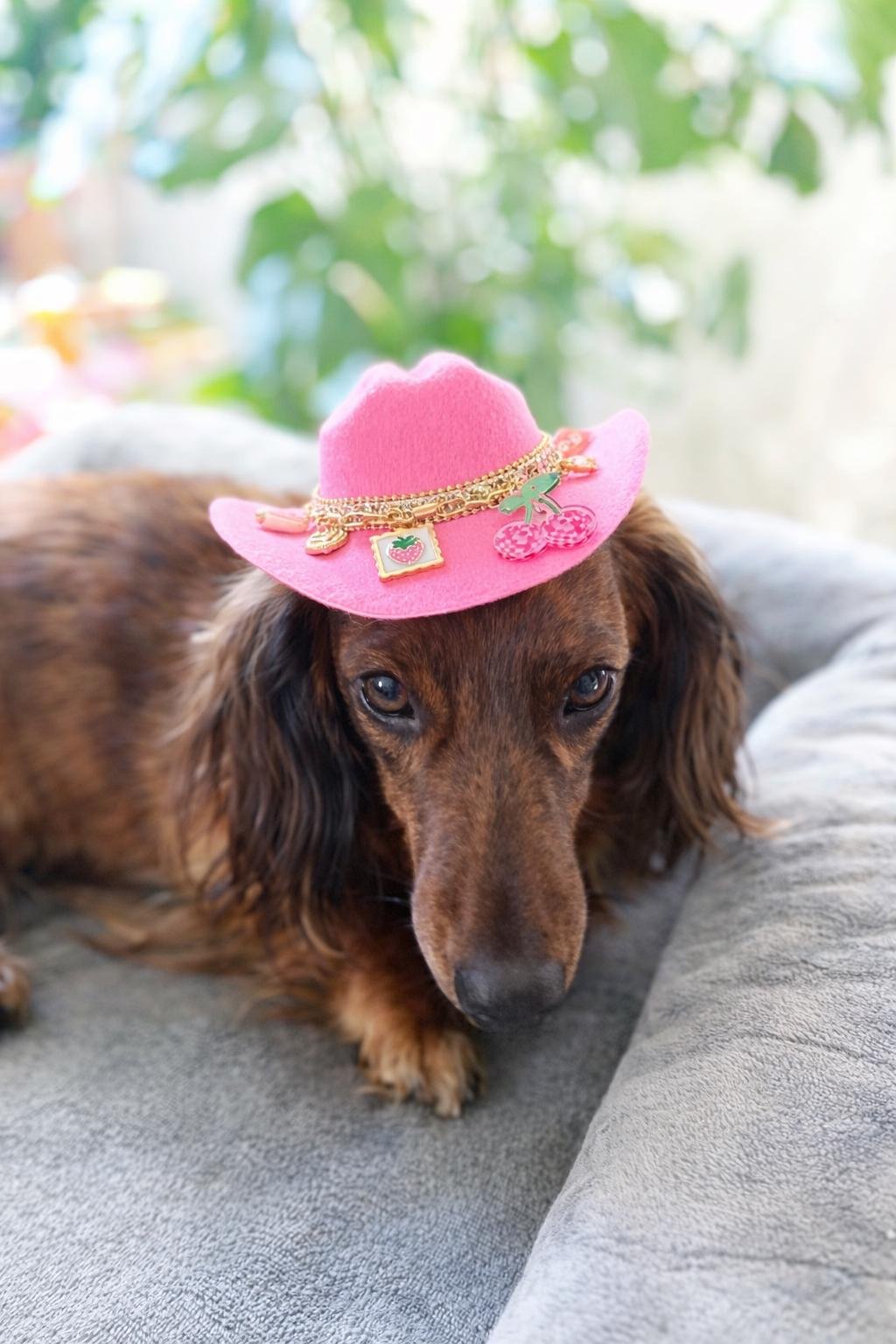 Perfect for pets who don't do basic. Our handmade pink rhinestone cowboy hat comes in small and large (2 different designs) for dogs (and cats!) of all sizes. Customize by selecting charm and tassel!